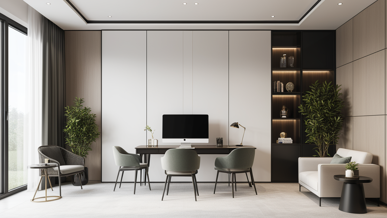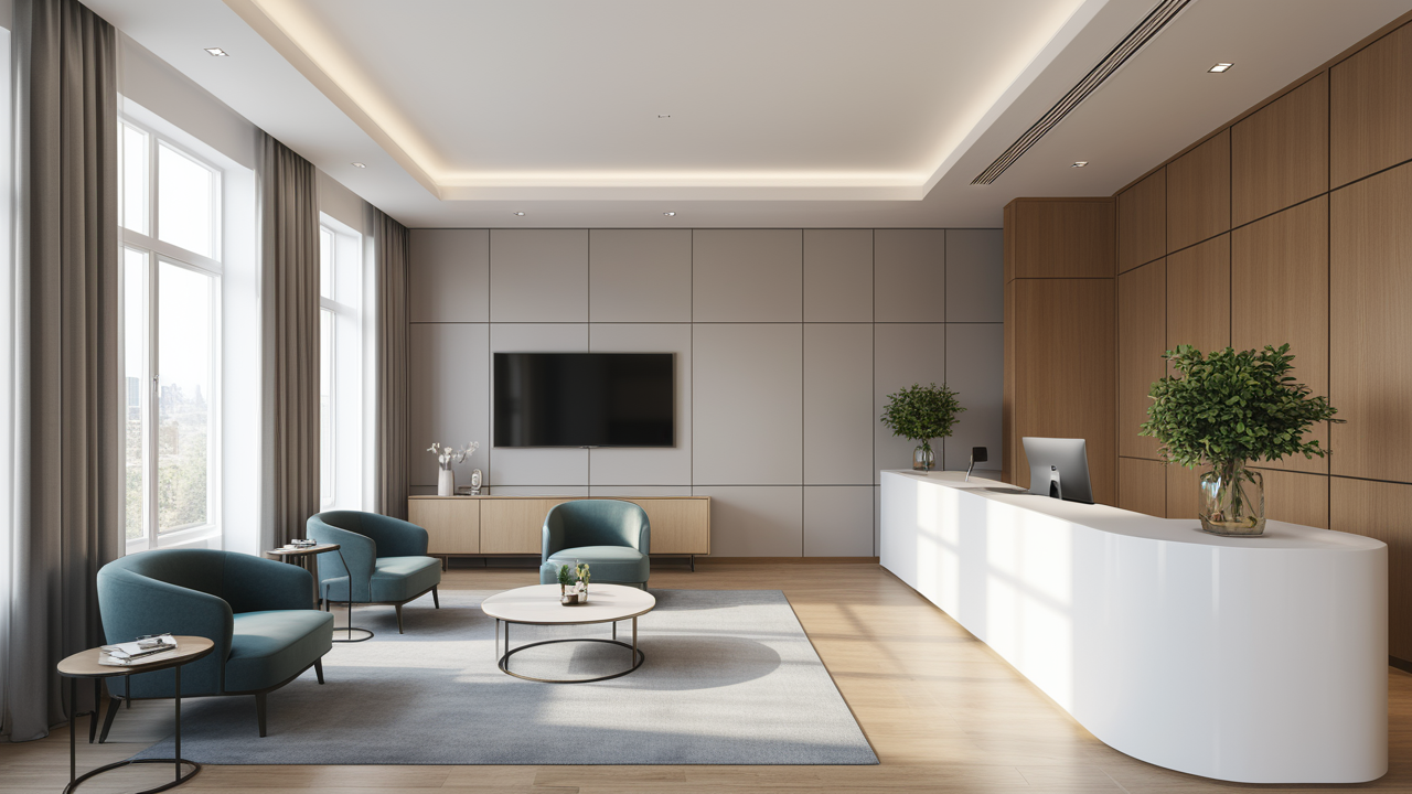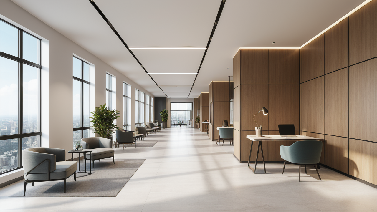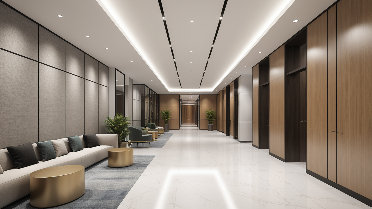本案設(shè)計(jì)為突顯建筑開(kāi)間較舒適之優(yōu)點(diǎn),設(shè)計(jì)師特意設(shè)計(jì)了過(guò)道各柱體間鑲嵌不銹鋼條及玻璃幕墻上的磨砂條來(lái)點(diǎn)綴的裝修主題,同時(shí),地面用拼花色帶打破,與方正而美觀的吊頂上下呼應(yīng);辦公室靠近走道的墻面,為將自然光透入走道,同時(shí)又加強(qiáng)其“靈透”感,采用清玻幕墻,幕墻上的磨砂條既打破了玻璃墻面的呆板,又提醒了行人幕墻的存在,防止無(wú)意識(shí)碰頭、沖撞等類(lèi)似意外發(fā)生;為辦公室的后續(xù)私密性考慮,其清玻幕墻內(nèi)掛以百葉窗遮擋既可。