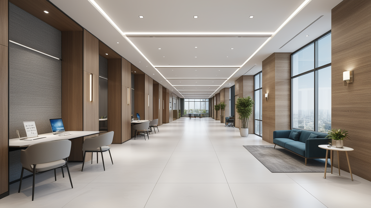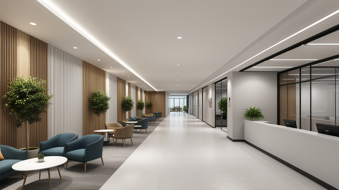 本案設(shè)計(jì)在處理上,特設(shè)計(jì)了可向客戶展示企業(yè)榮譽(yù)品的展示墻,用料實(shí)際,無(wú)須雕琢張揚(yáng),直線條的造型讓整個(gè)空間顯得穩(wěn)重大方,淺色系材料的運(yùn)用延續(xù)了靈動(dòng)而清澈的氣韻,大方莊重卻內(nèi)含現(xiàn)代時(shí)尚。而且色調(diào)淡雅的地毯、沙發(fā)、背景,還突出了接待廳親切、和睦、寬松的氛圍,使穩(wěn)靜而坦誠(chéng)的晤談氣氛盎然一室。