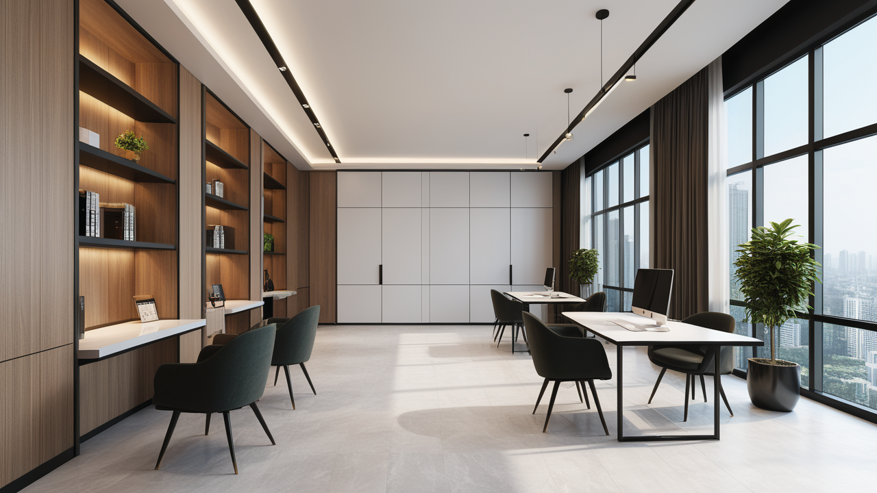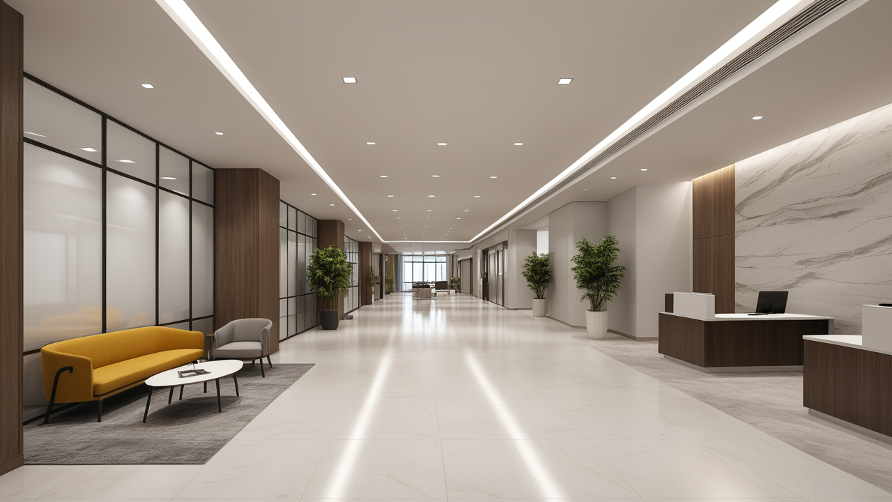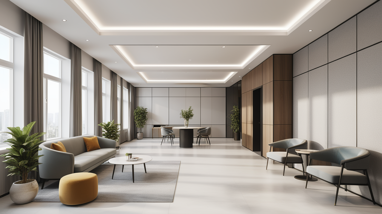 本案在設計中采用環(huán)環(huán)相扣的圓弧頂面造型,層層遞近的燈具圍繞圓型屋頂向外拓展,突出空間的立體造型感,也使天花燈飾顯出碧玉般通透潤澤的光影。設計成舞臺平臺的主席臺具備多功能的特點,可兼顧各類舞臺表演及大型會場會議的組織。粗曠沉穩(wěn)的圓形大立柱及方柱,頗具雄偉之勢,但是考慮到其在大型場地內的阻礙性問題,故不將此做再多修飾,僅僅以真石漆的噴涂來達到既不擴大柱圍又美化柱體的作用;地面以座位的安排為向導,輔以簡易直紋拼花來點綴。