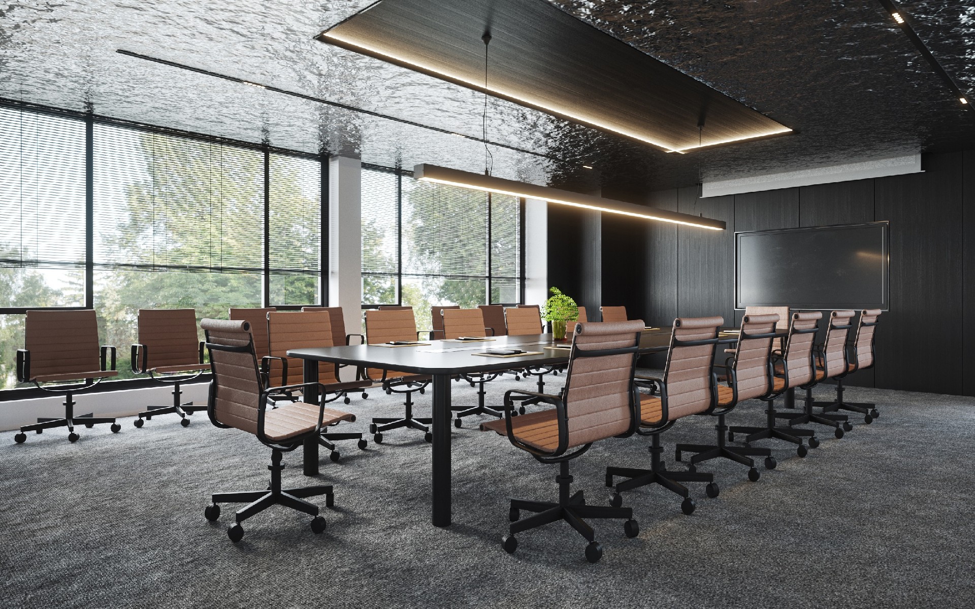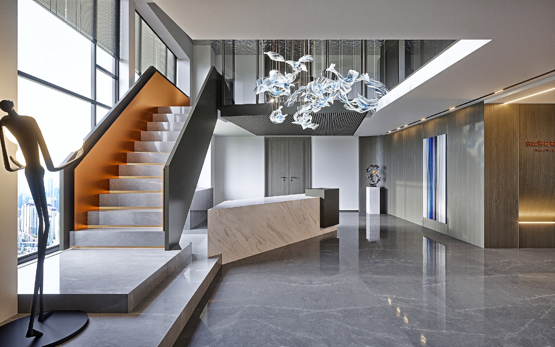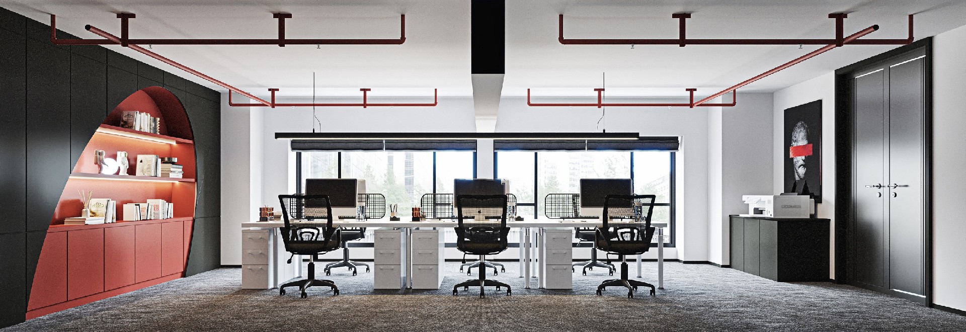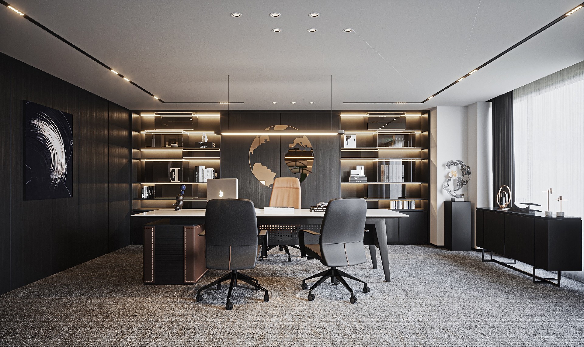 本案在設(shè)計(jì)中因?yàn)榭臻g較寬敞,加之衛(wèi)生間門的開向正對室內(nèi),特設(shè)計(jì)了展示性隔斷柜,加強(qiáng)其辦公、會客及生活的區(qū)域性,既做到了空間上的劃分,又可通過展示柜內(nèi)的擺設(shè)輔助室內(nèi)布置呈現(xiàn)事業(yè)風(fēng)貌及個人雅興,體現(xiàn)其穩(wěn)重而時尚的人性化的特點(diǎn)。