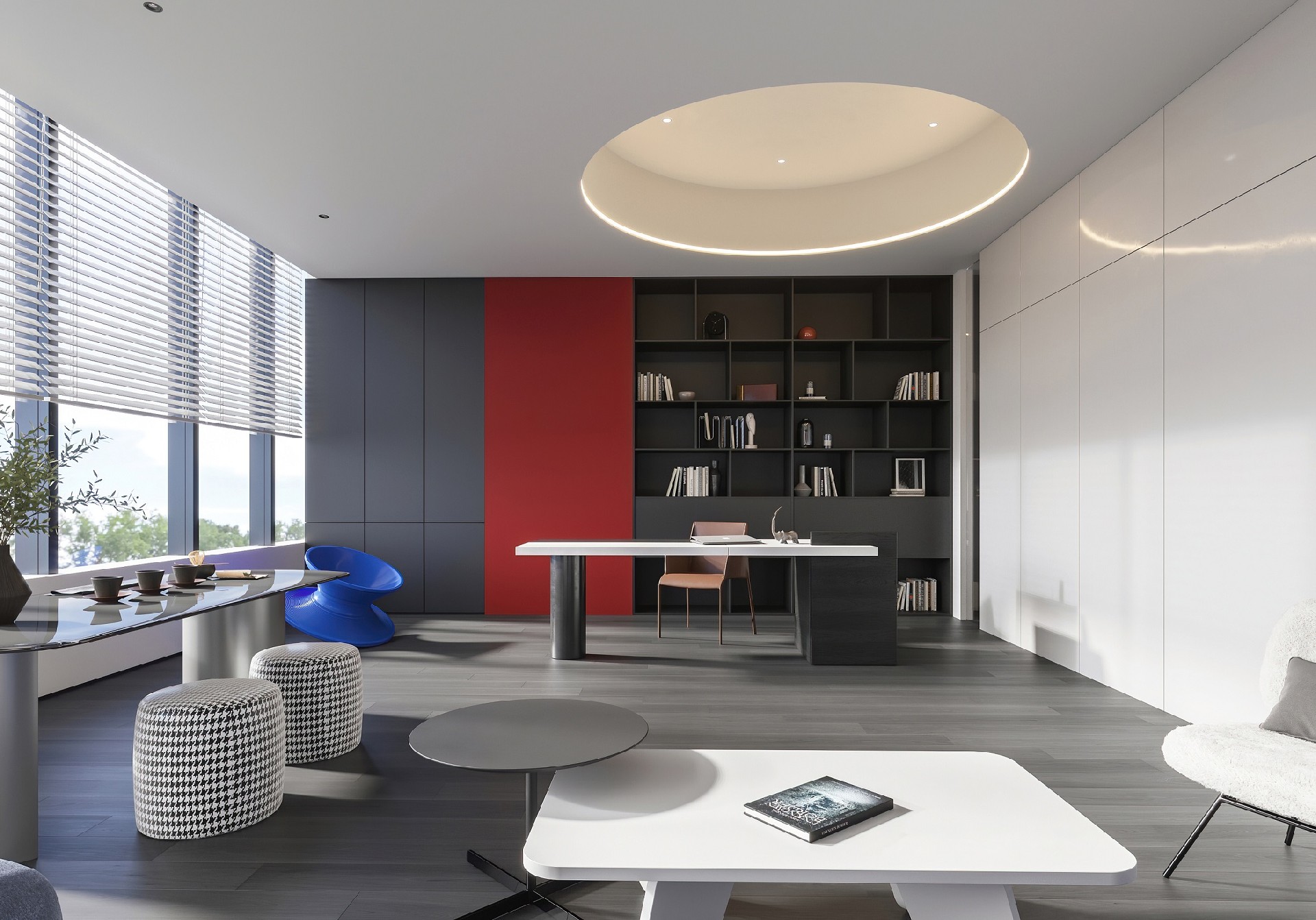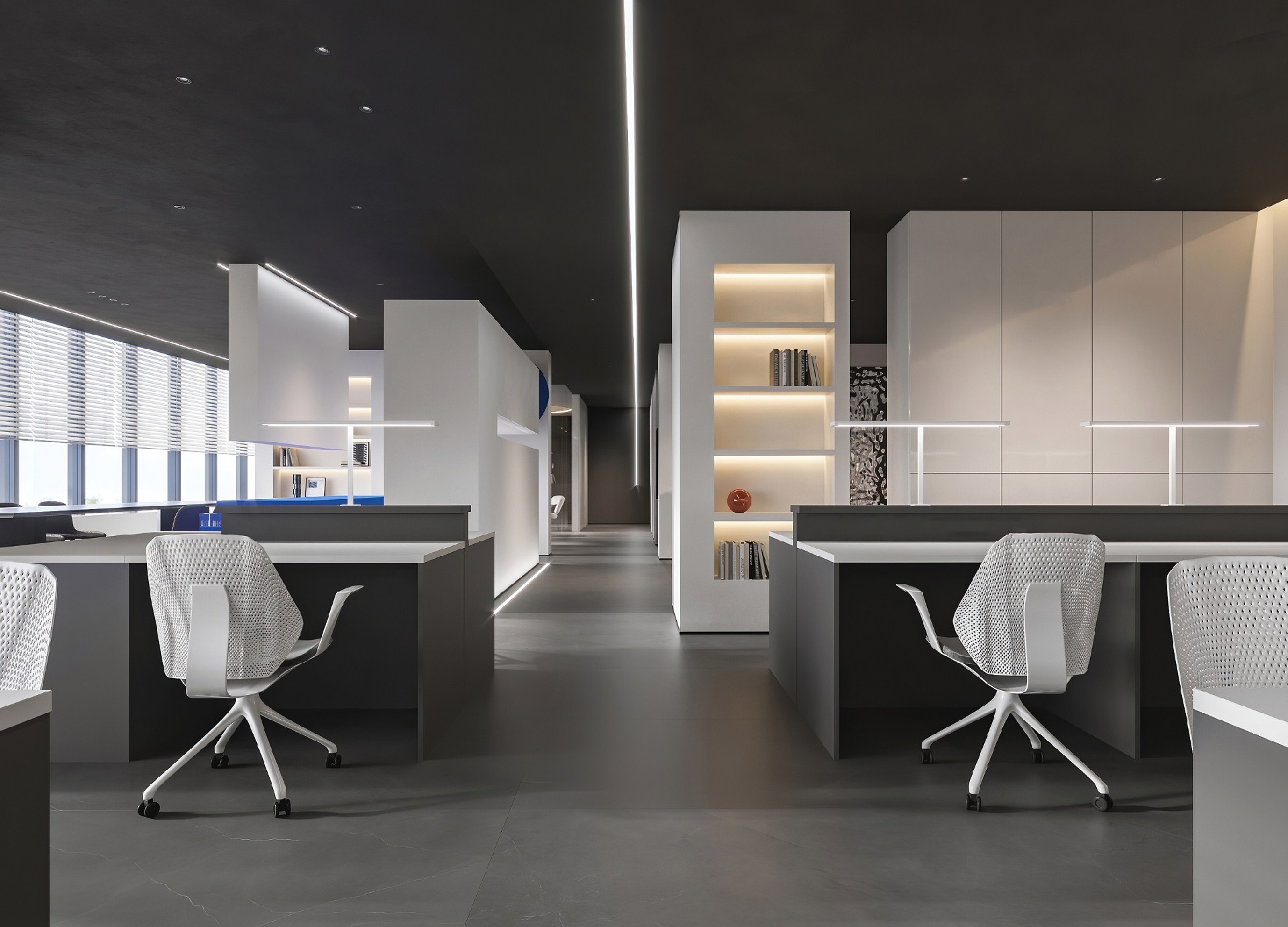 本案屬于簡(jiǎn)約的風(fēng)格,簡(jiǎn)單而有品位,色調(diào)冷暖結(jié)合。辦公環(huán)境的風(fēng)格取向、舒適與否對(duì)于提升員工的工作效率和體現(xiàn)企業(yè)文化起到至關(guān)重要的作用。辦公室整體色調(diào)采用藍(lán)灰調(diào),使員工辦公的心情能夠沉靜下來,工作效率自然可以得到提高。有一位建筑大師曾說過:“當(dāng)綠化、光和風(fēng)根據(jù)人的意念從原先自然中抽象出來,它們就趨向天堂”。我們?cè)谑覂?nèi)引入天光設(shè)置了自然植物,將室外的感覺引入室內(nèi)空間,使辦公環(huán)境更具活力。
