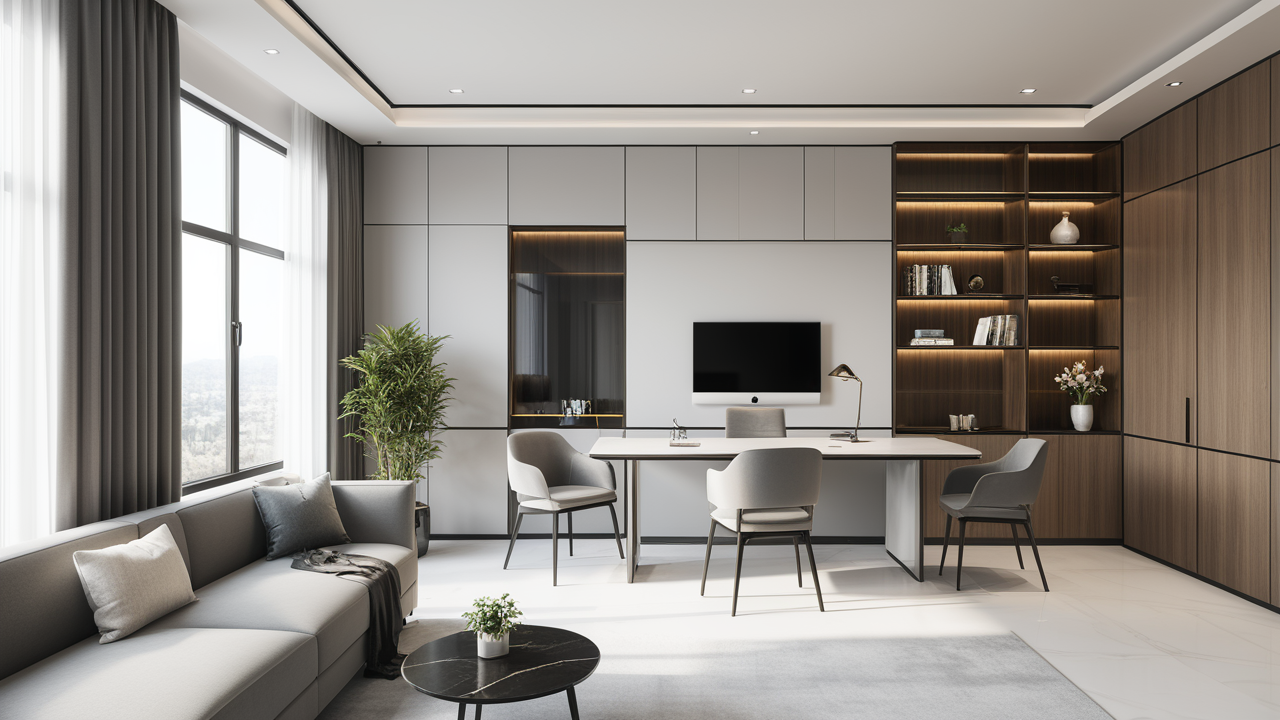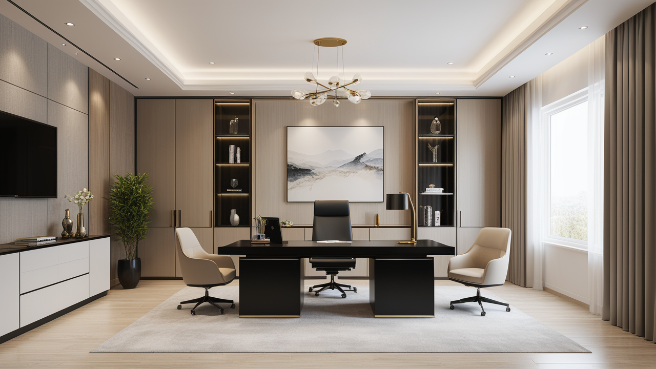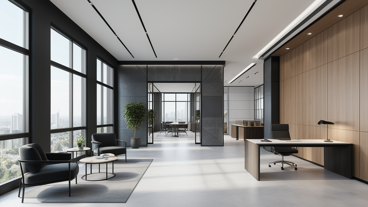 本案設(shè)計為突顯建筑開間較舒適之優(yōu)點,設(shè)計師特意設(shè)計了過道各柱體間鑲嵌不銹鋼條及玻璃幕墻上的磨砂條來點綴的裝修主題,同時,地面用拼花色帶打破,與方正而美觀的吊頂上下呼應(yīng);辦公室靠近走道的墻面,為將自然光透入走道,同時又加強其“靈透”感,采用清玻幕墻,幕墻上的磨砂條既打破了玻璃墻面的呆板,又提醒了行人幕墻的存在,防止無意識碰頭、沖撞等類似意外發(fā)生;為辦公室的后續(xù)私密性考慮,其清玻幕墻內(nèi)掛以百葉窗遮擋既可。