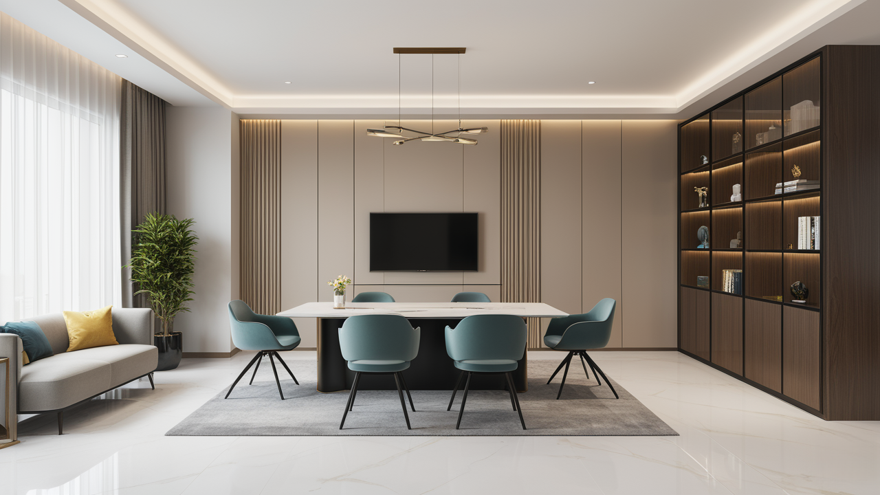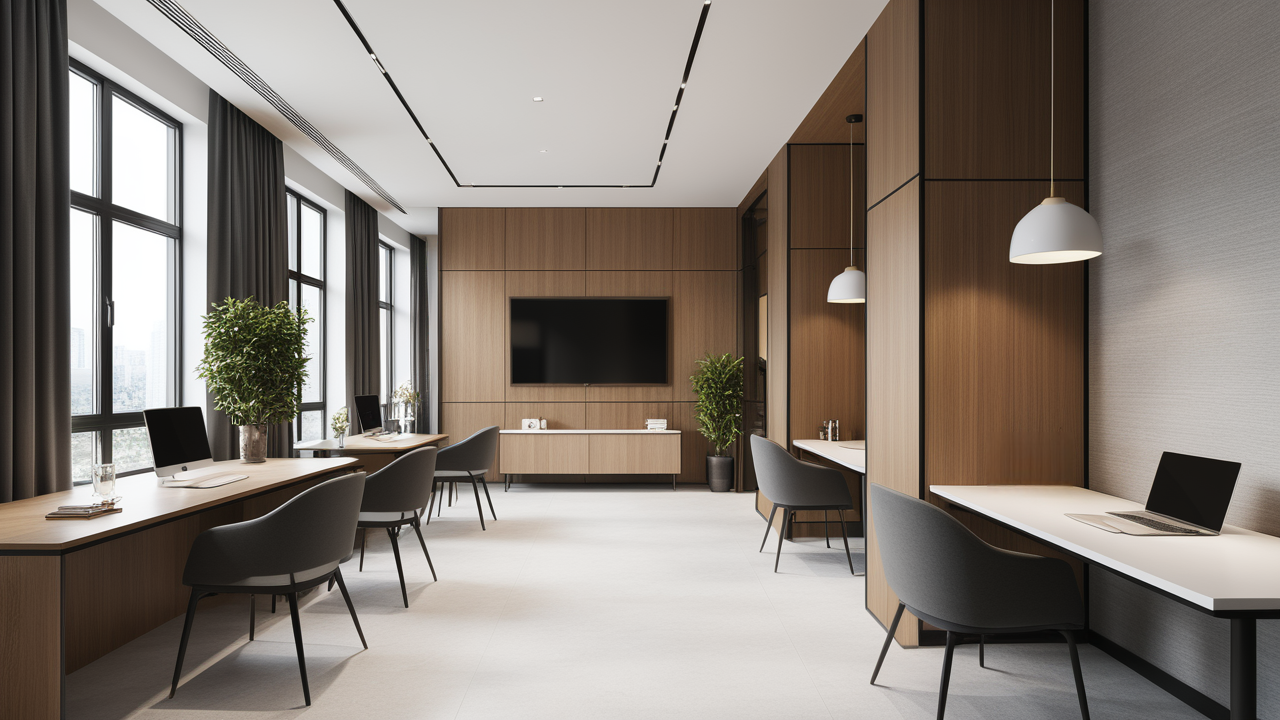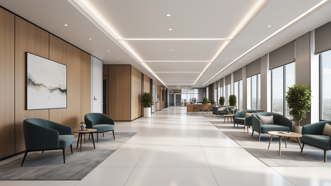 本案設(shè)計在處理上,特設(shè)計了可向客戶展示企業(yè)榮譽品的展示墻,用料實際,無須雕琢張揚,直線條的造型讓整個空間顯得穩(wěn)重大方,淺色系材料的運用延續(xù)了靈動而清澈的氣韻,大方莊重卻內(nèi)含現(xiàn)代時尚。而且色調(diào)淡雅的地毯、沙發(fā)、背景,還突出了接待廳親切、和睦、寬松的氛圍,使穩(wěn)靜而坦誠的晤談氣氛盎然一室。