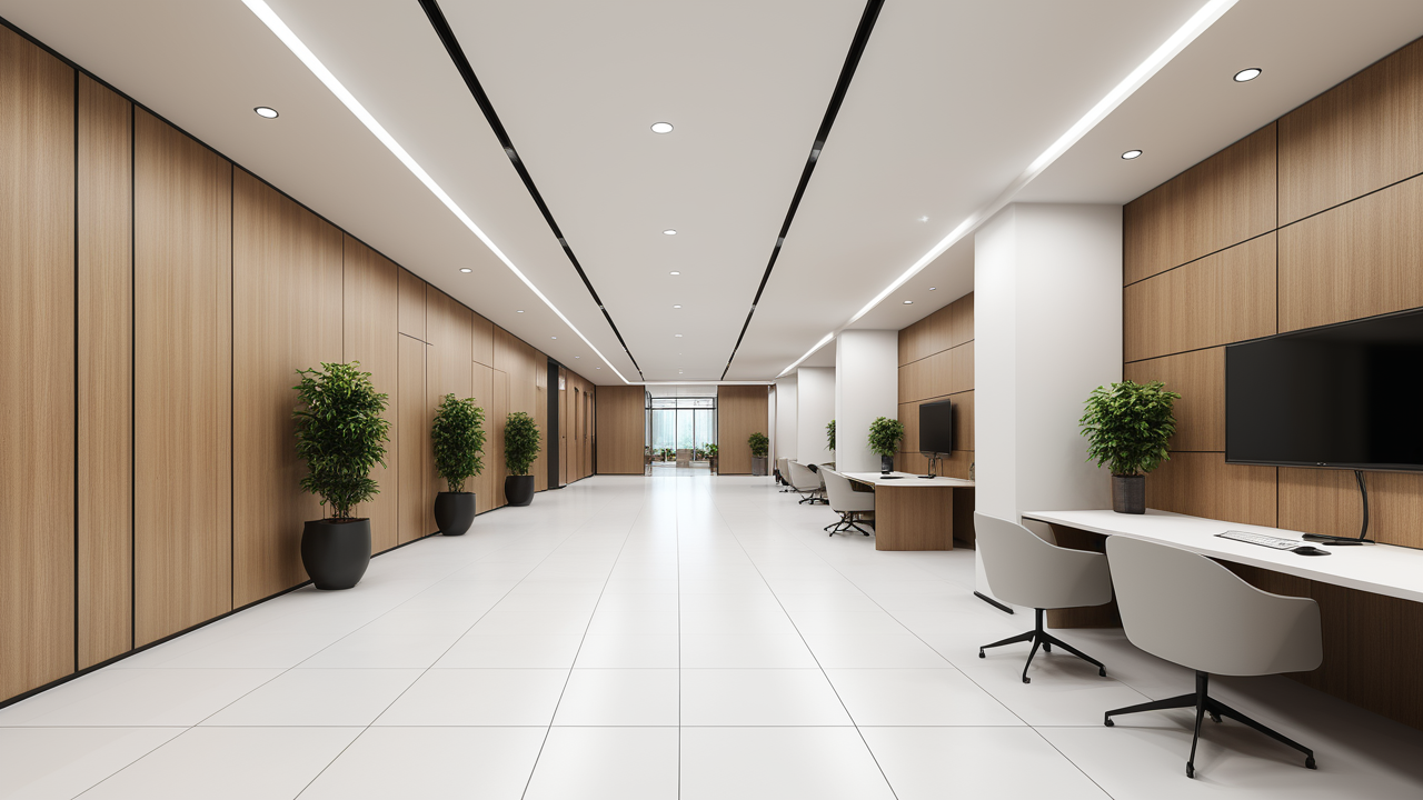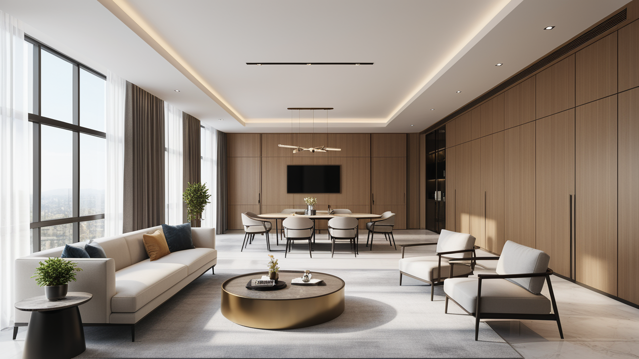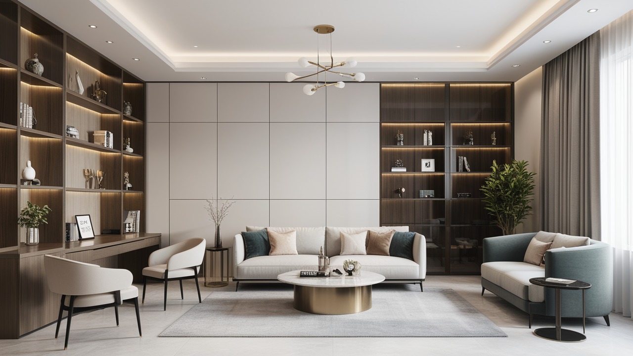 本案設(shè)計(jì)在處理上,特設(shè)計(jì)了可向客戶展示企業(yè)榮譽(yù)品的展示墻,用料實(shí)際,無須雕琢張揚(yáng),直線條的造型讓整個(gè)空間顯得穩(wěn)重大方,淺色系材料的運(yùn)用延續(xù)了靈動(dòng)而清澈的氣韻,大方莊重卻內(nèi)含現(xiàn)代時(shí)尚。而且色調(diào)淡雅的地毯、沙發(fā)、背景,還突出了接待廳親切、和睦、寬松的氛圍,使穩(wěn)靜而坦誠的晤談氣氛盎然一室。