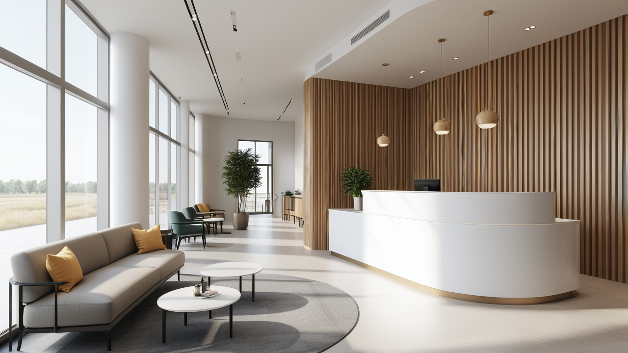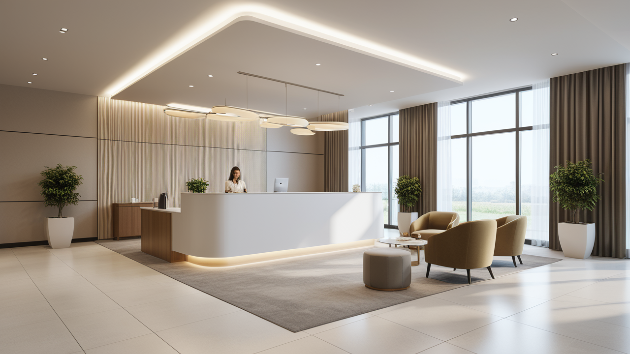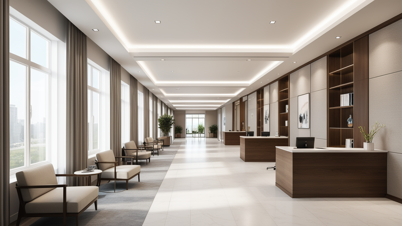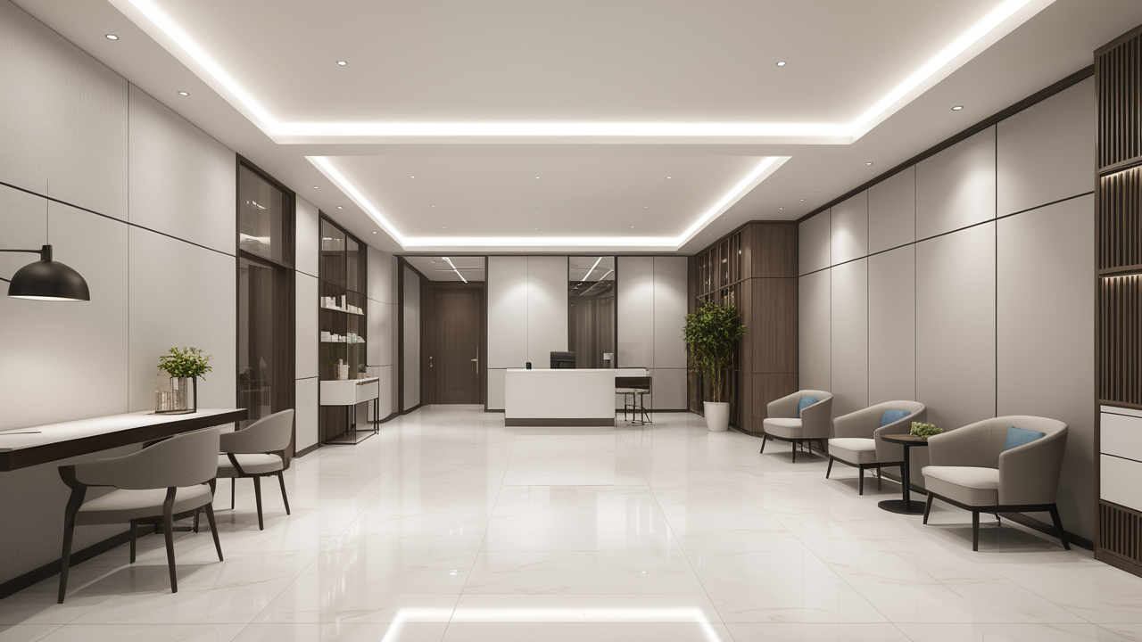 本案設(shè)計為突顯建筑開間較舒適之優(yōu)點,設(shè)計師特意設(shè)計了過道各柱體間鑲嵌不銹鋼條及玻璃幕墻上的磨砂條來點綴的裝修主題,同時,地面用拼花色帶打破,與方正而美觀的吊頂上下呼應(yīng);辦公室靠近走道的墻面,為將自然光透入走道,同時又加強(qiáng)其“靈透”感,采用清玻幕墻,幕墻上的磨砂條既打破了玻璃墻面的呆板,又提醒了行人幕墻的存在,防止無意識碰頭、沖撞等類似意外發(fā)生;為辦公室的后續(xù)私密性考慮,其清玻幕墻內(nèi)掛以百葉窗遮擋既可。