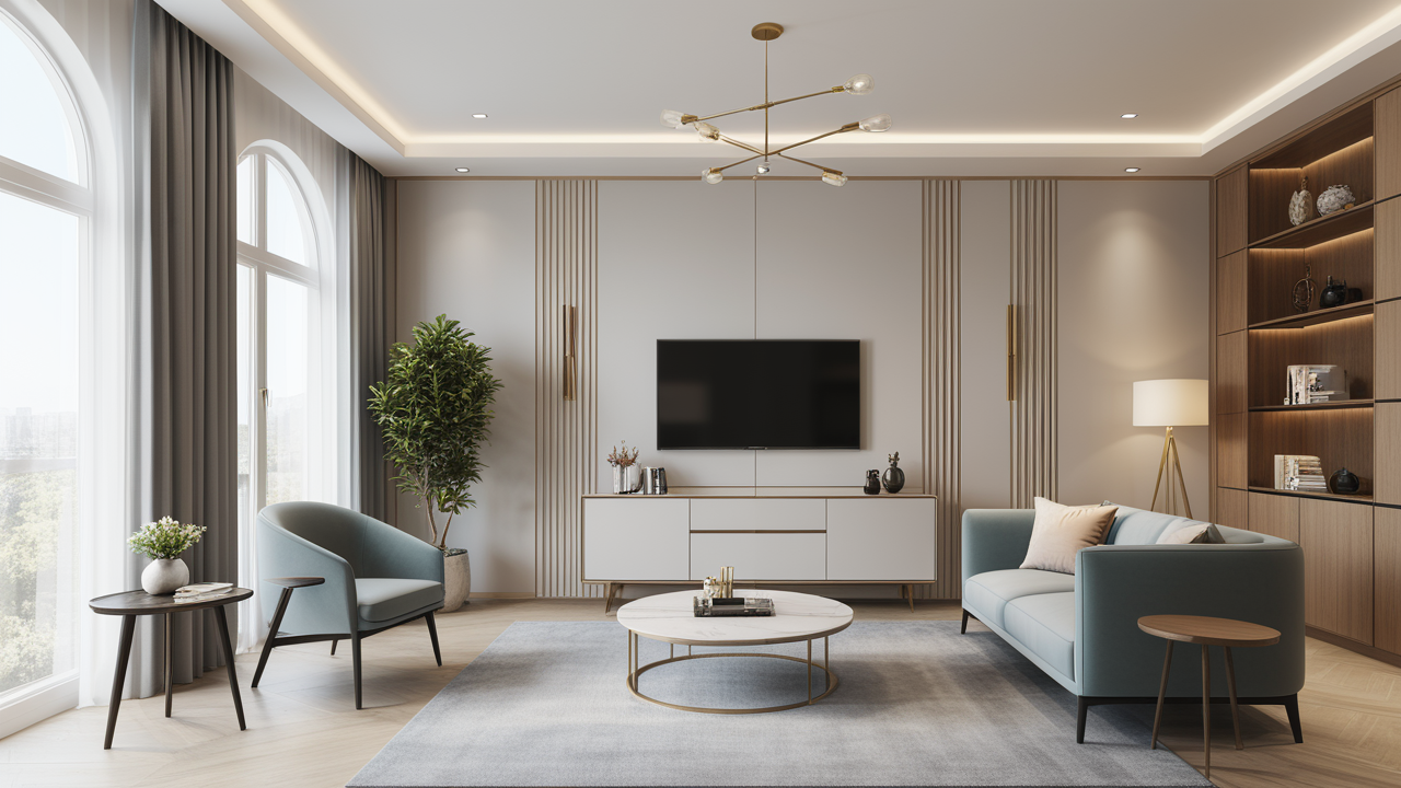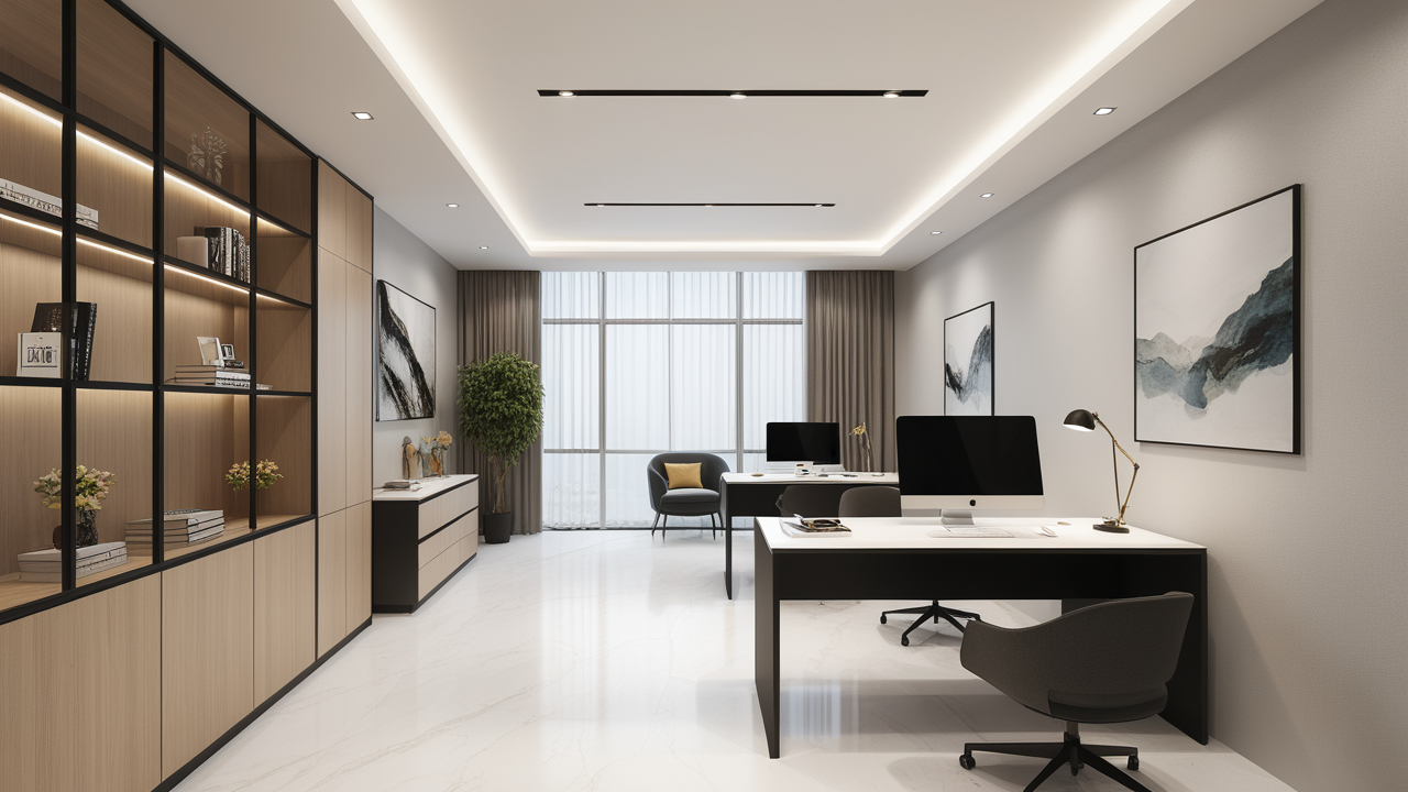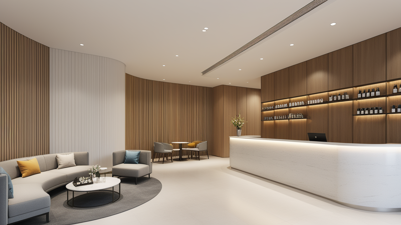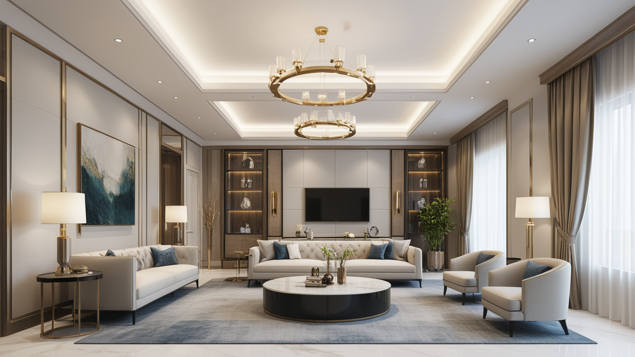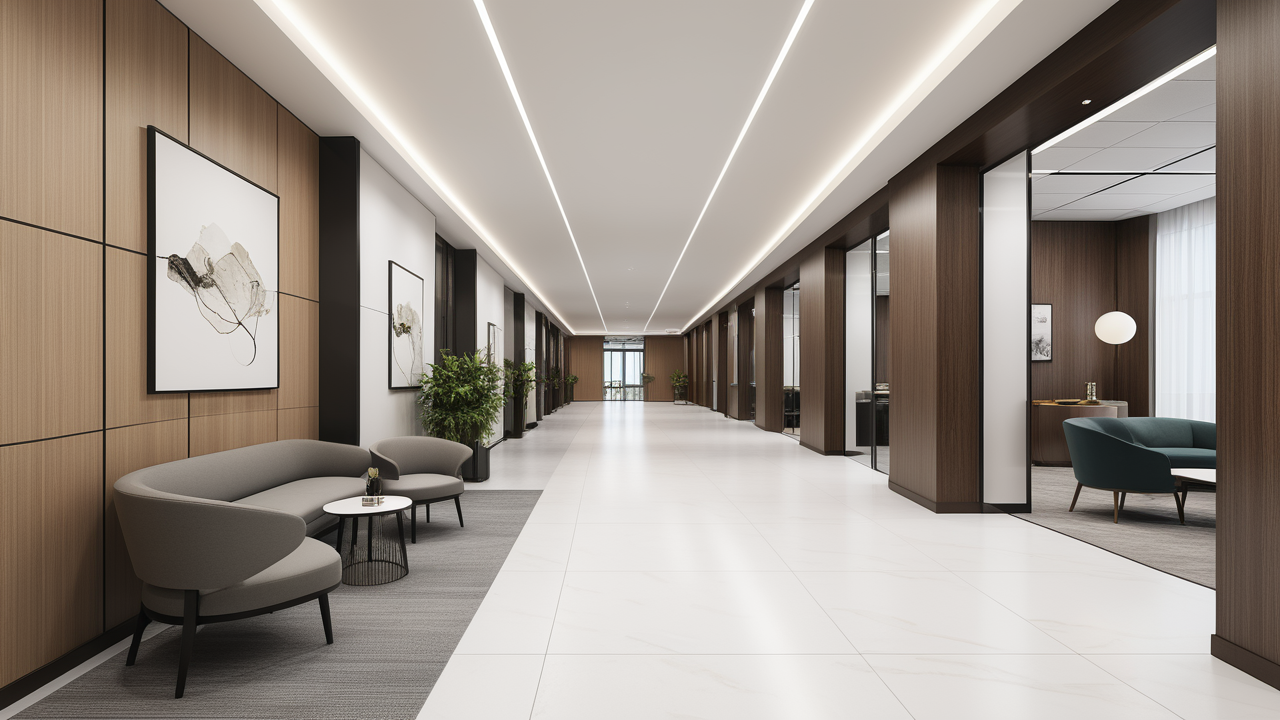 本案在設計中采用環(huán)環(huán)相扣的圓弧頂面造型,層層遞近的燈具圍繞圓型屋頂向外拓展,突出空間的立體造型感,也使天花燈飾顯出碧玉般通透潤澤的光影。設計成舞臺平臺的主席臺具備多功能的特點,可兼顧各類舞臺表演及大型會場會議的組織。粗曠沉穩(wěn)的圓形大立柱及方柱,頗具雄偉之勢,但是考慮到其在大型場地內(nèi)的阻礙性問題,故不將此做再多修飾,僅僅以真石漆的噴涂來達到既不擴大柱圍又美化柱體的作用;地面以座位的安排為向?qū)?,輔以簡易直紋拼花來點綴。